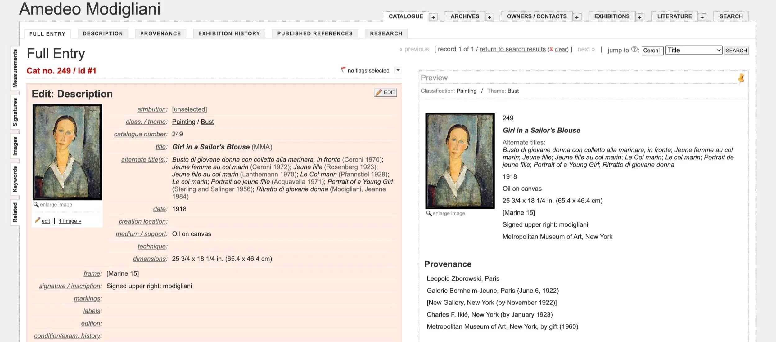 Until now, information related specifically to Modigliani’s life and work has not been maintained in a searchable, central location. To this end, The Modigliani Initiative has established and maintains a state-of-the-art database. The software’s user-friendly search features foster scholarly analysis and the ability to cross-reference works of art, dealers, collectors, exhibitions, and related literature.